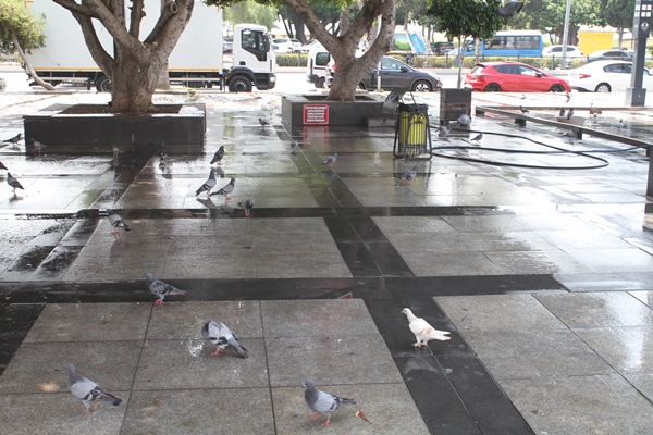 Aşırı sıcaklardan dolayı halsiz kalan ve neredeyse uçamaz hale gelen güvercinler, cami avlusunda gölgeli alanlara sığındı.