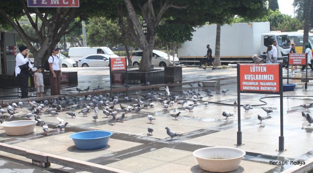 MERSİN'DE ETKİLİ OLAN AŞIRI SICAKLAR ULU CAMİ ÖNÜNDE KUŞLARI OLUMSUZ ETKİLERKEN, KUŞLAR ÇOCUKLARIN İLGİ ODAĞI HALİNE GELDİ.